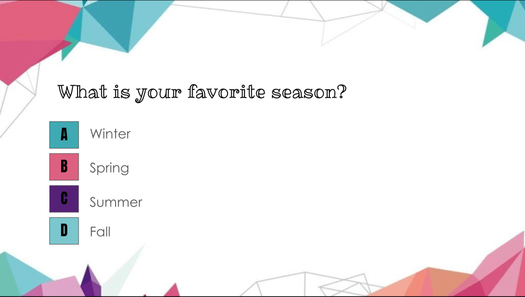 - Ask fun “Would You Rather…” questions with multiple-choice answers (Example: Would you rather fly, be invisible, talk to animals, or breathe underwater?)