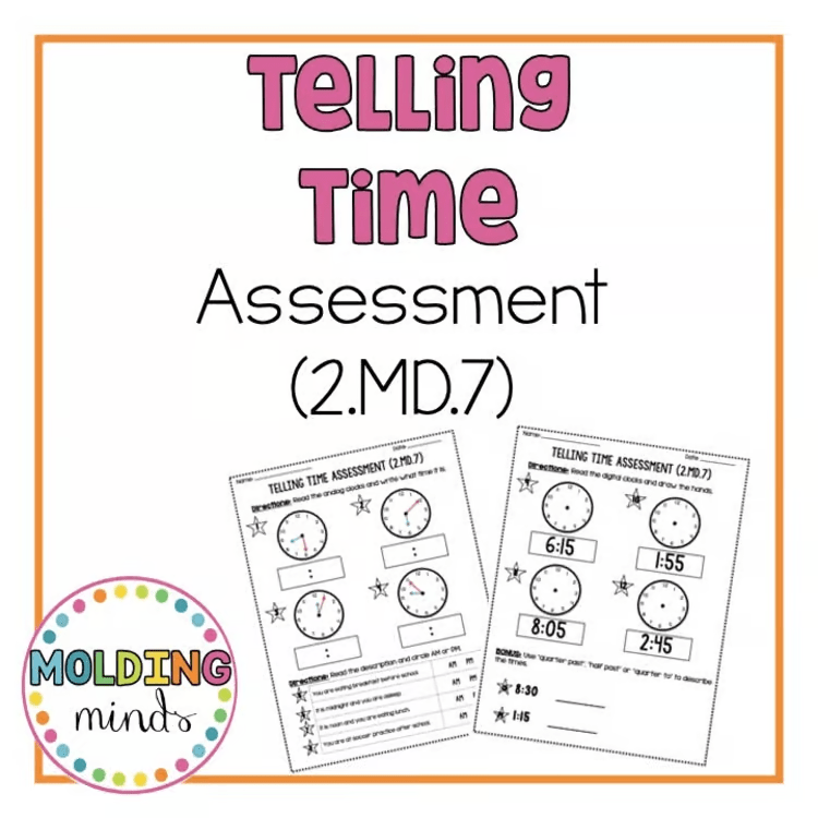 2nd Grade Telling Time Assessment | Nearest 5 Minutes, AM/PM, Quarter Hours MD.7